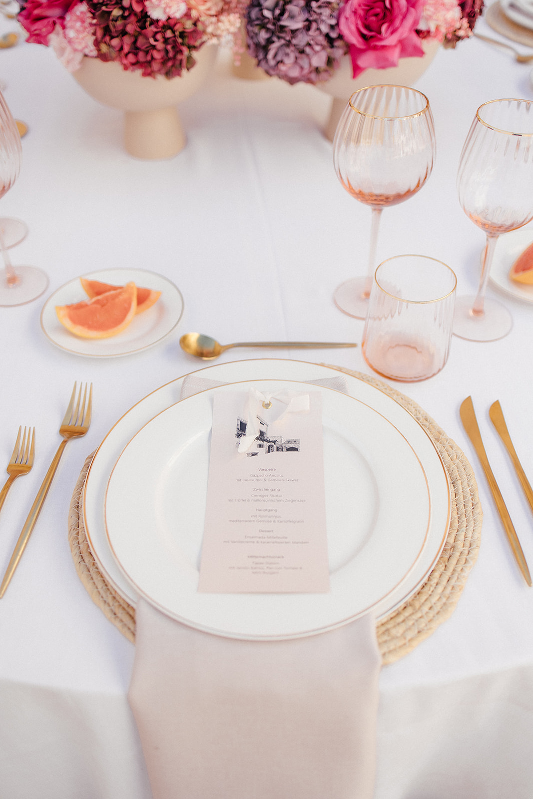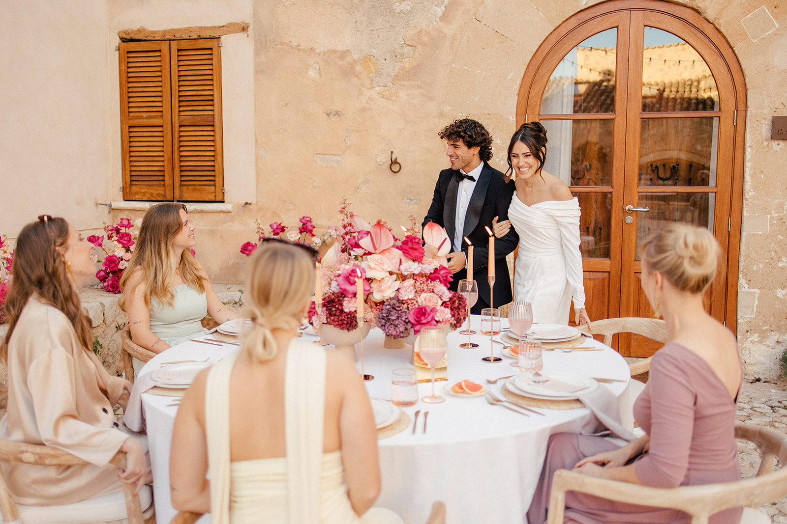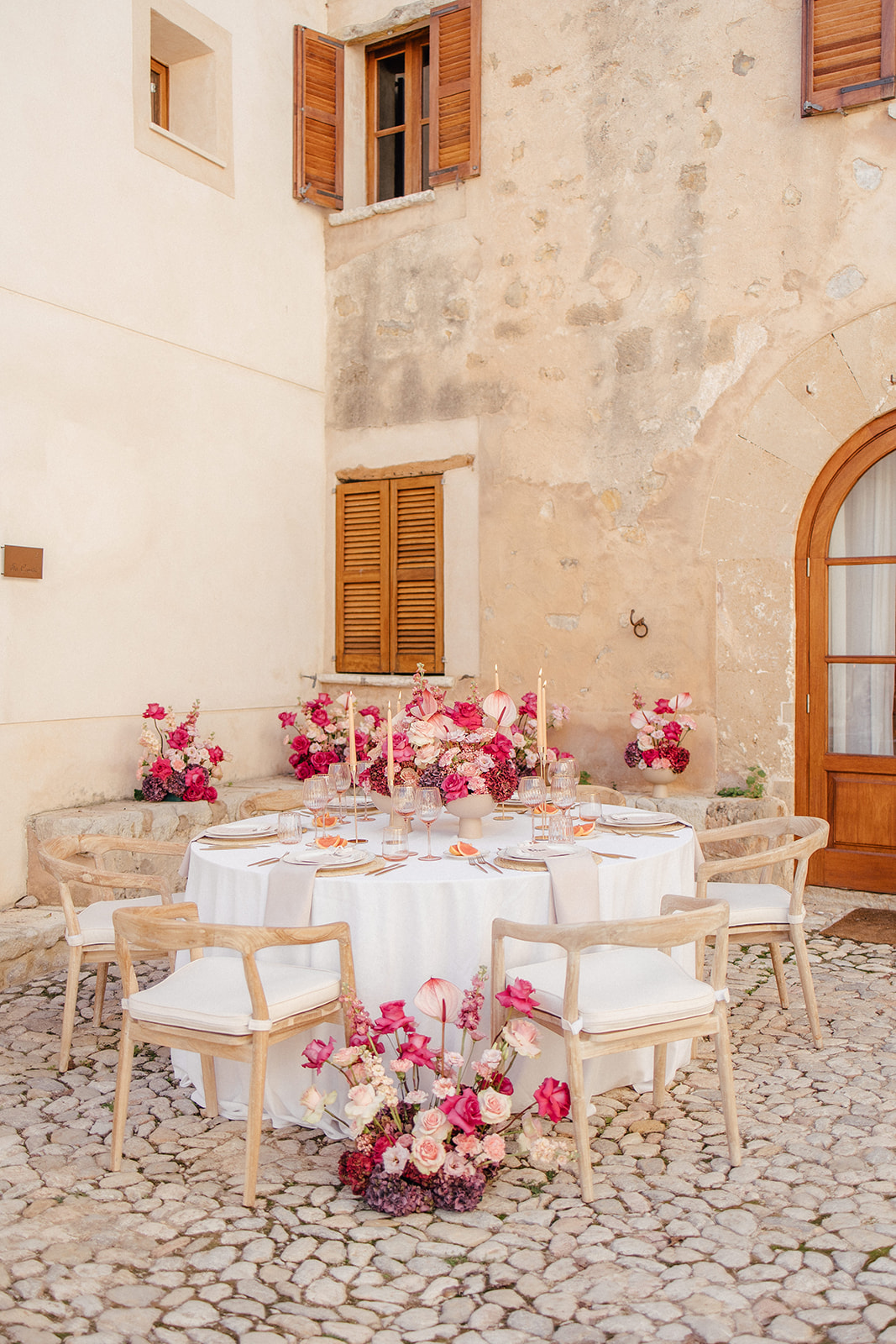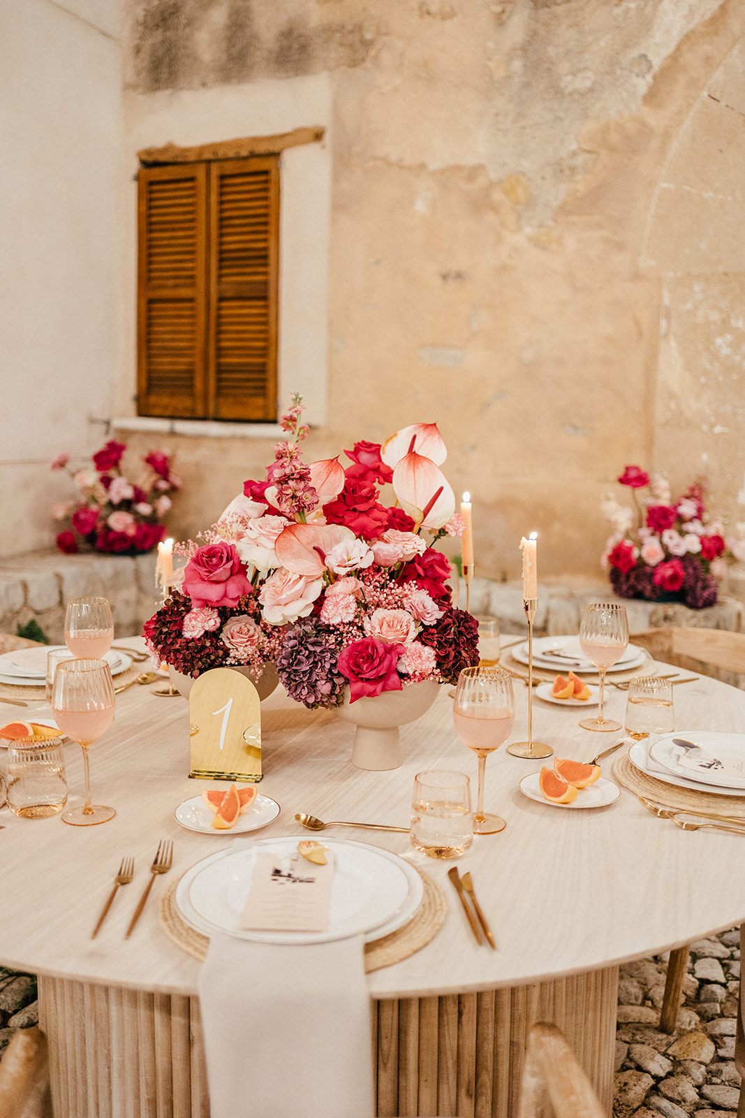 Die Kulisse: eine lichtdurchflutete Finca mit historischem Innenhof, umgeben von sanften Rosé- und Blushtönen, kräftigen Pinknuancen in der Floristik und warmen Goldakzenten.