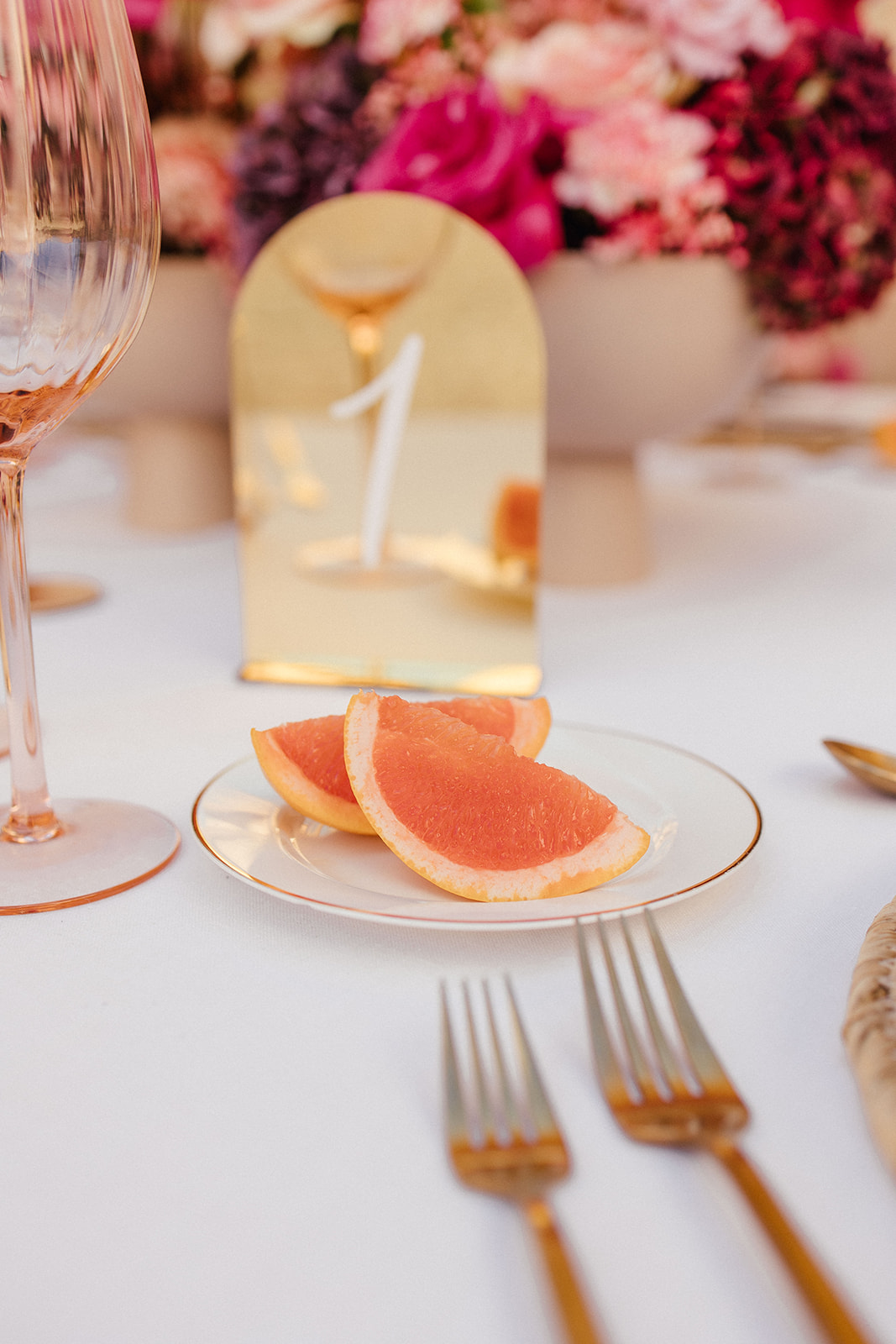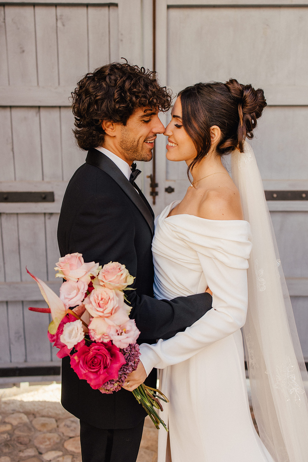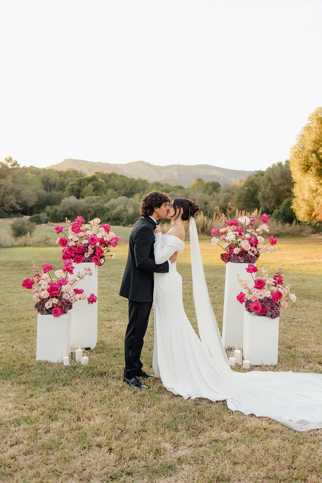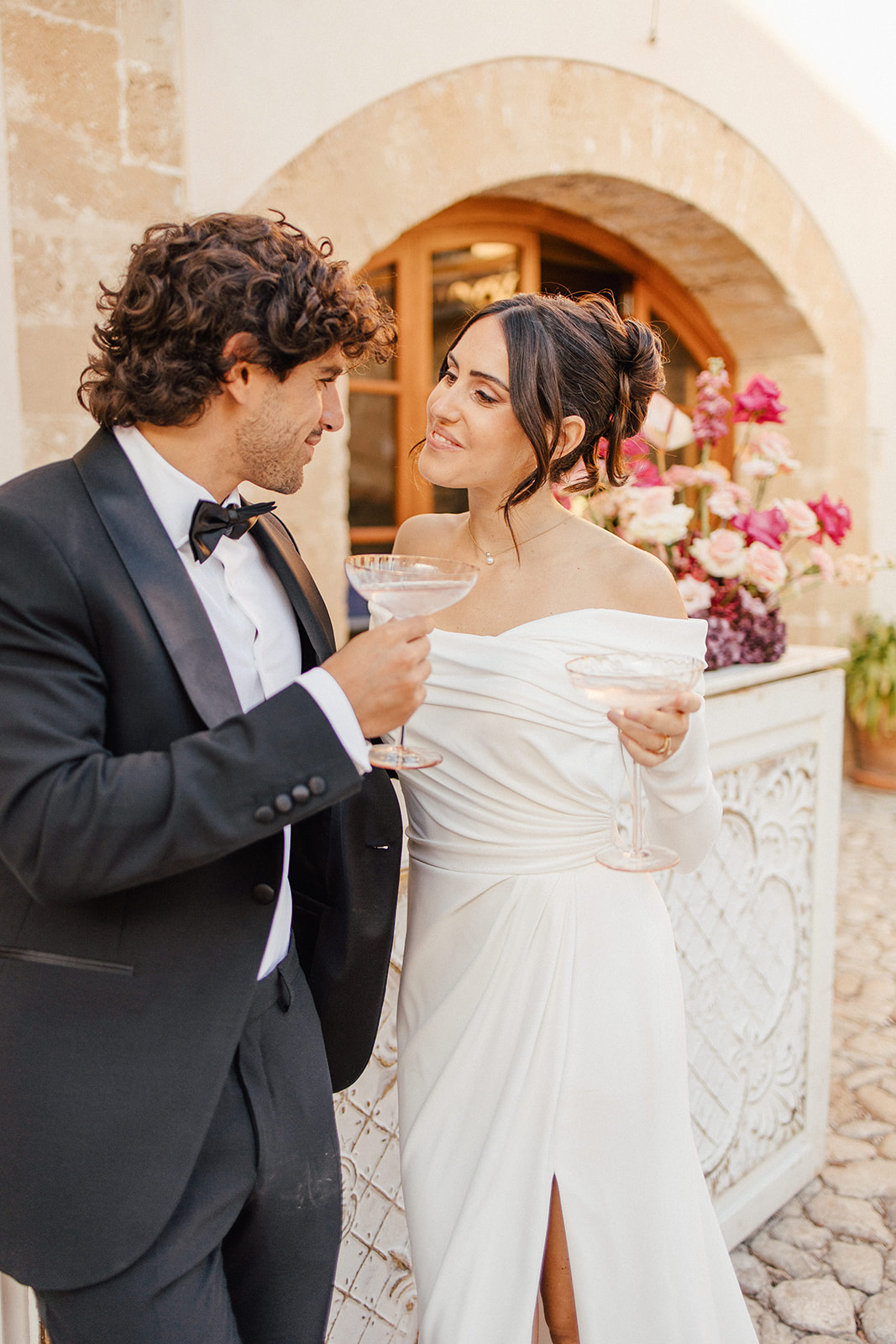 Die Kulisse: eine lichtdurchflutete Finca mit historischem Innenhof, umgeben von sanften Rosé- und Blushtönen, kräftigen Pinknuancen in der Floristik und warmen Goldakzenten.