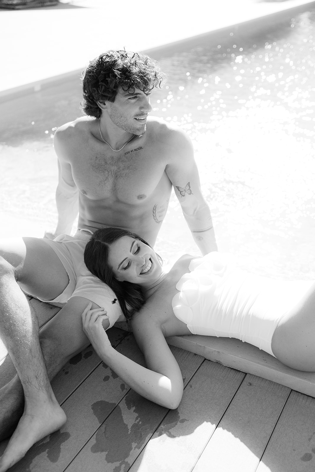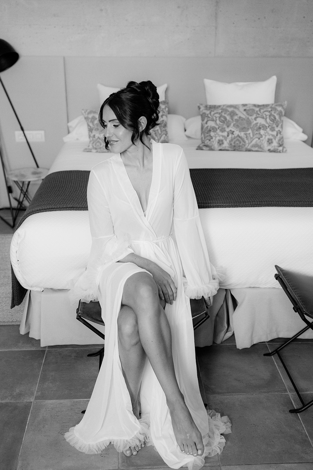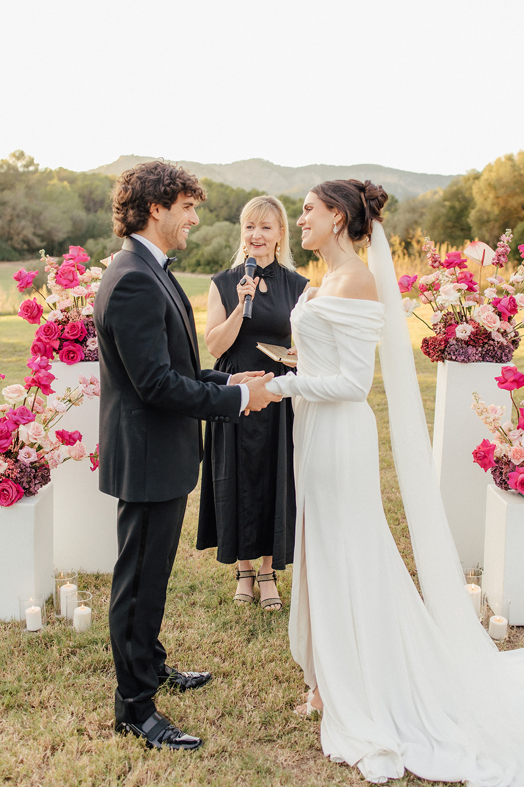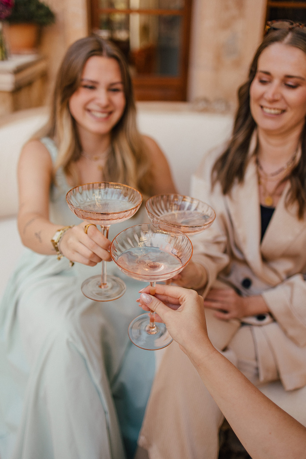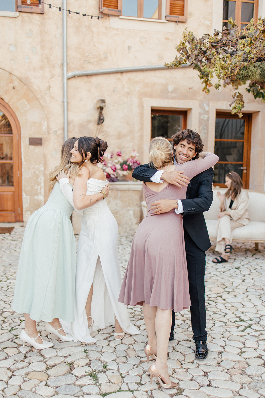 Das Hochzeitswochenende beginnt entspannt mit einer Pool Party am Vortag – barfuß, sonnig und voller Vorfreude. Am Hochzeitstag selbst findet das Getting Ready in den ruhigen Räumen der Finca statt, bevor die freie Trauung auf der grünen Wiese im Garten gefeiert wird. Die Trauzeugen tragen harmonische Pastelltöne und fügen sich dezent in das Farbkonzept ein.