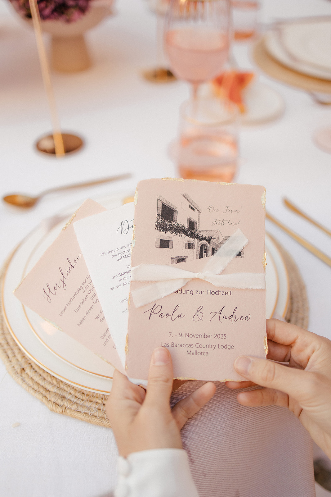 Diese Papeterie ist kein lautes Statement, sondern ein leiser, eleganter Begleiter, der sich harmonisch in das Gesamtkonzept einfügt. Mit feinen Materialien, handwerklichen Details und einer reduzierten Gestaltung unterstreicht sie die mediterrane Hochzeitsästhetik auf subtile Weise. Sie lässt Raum für Atmosphäre, Emotion und Leichtigkeit und verbindet alle Elemente der Hochzeit zu einem stimmigen, zeitlosen Gesamtbild.
