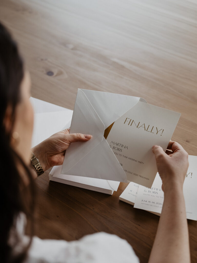 Die Haupteinladung ist das Herzstück eurer Papeterie und sollte 4 bis 6 Monate vor der Hochzeit bei euren Gästen eintreffen. Dieser Zeitraum gibt ihnen genug Planungssicherheit für Reisebuchungen, Outfitkauf und eventuelle Kinderbetreuung.